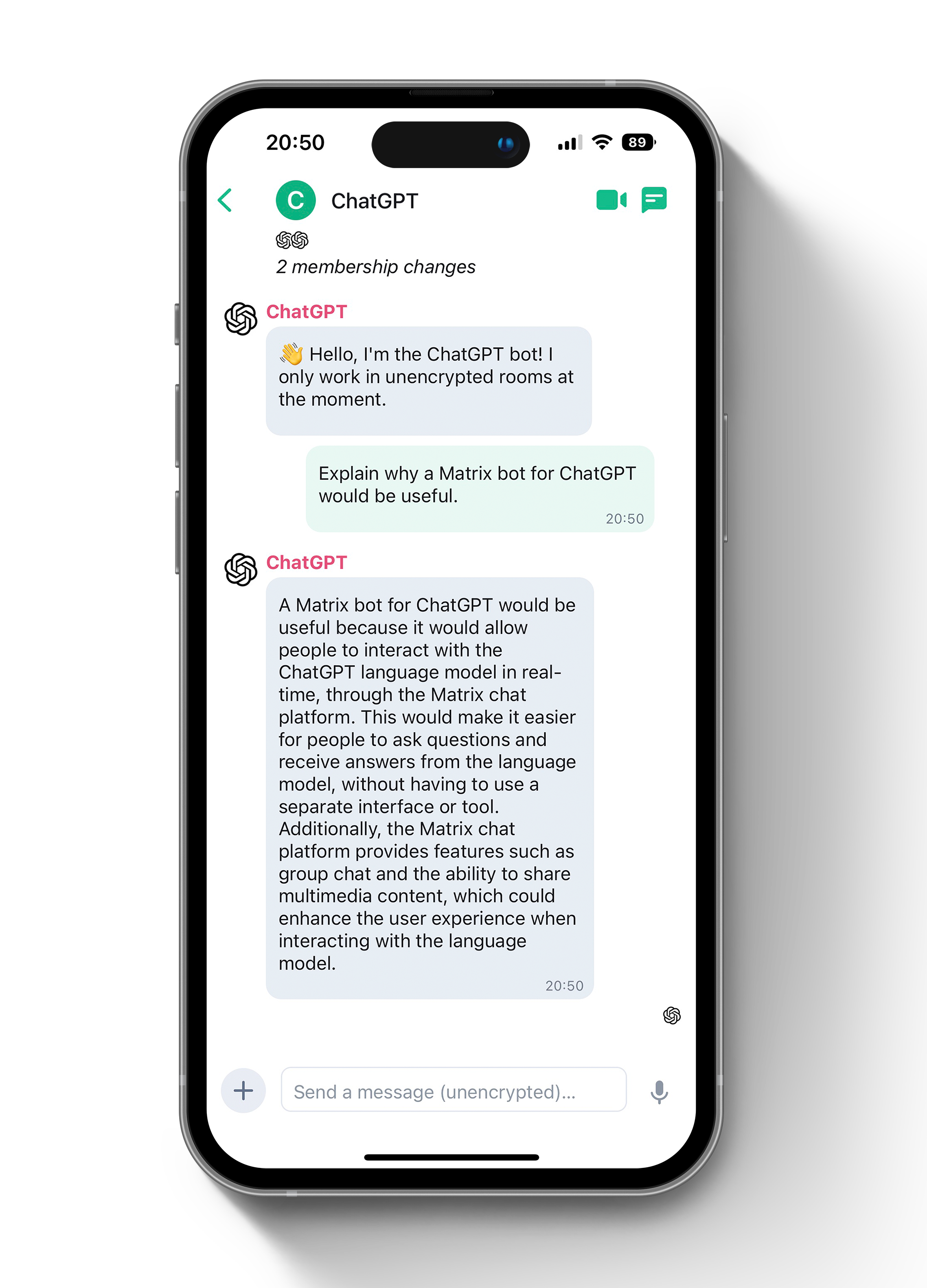 I built a ChatGPT bot for Matrix! It does exactly what you think it does: you send a message, and ChatGPT will respond. It's very cool being able to talk to ChatGPT while on a mobile device.