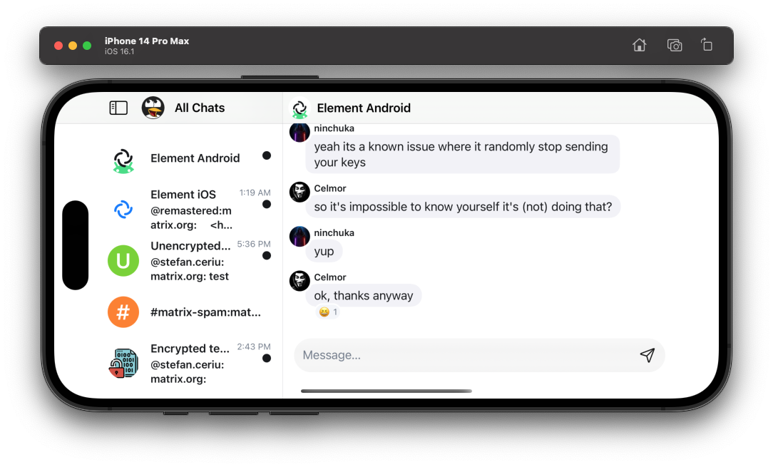 ๐๏ธ On the ElementX side we have been working on a Reactions picker, the timeline rewrite is almost finished, work on a split view layout for iPad continues and weโre finishing up a shiny new Room Details screen.