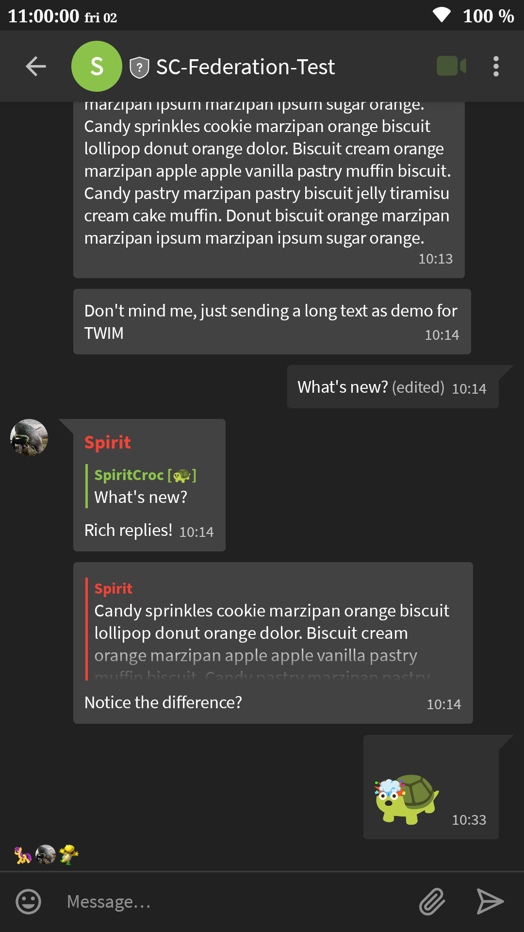 On the app itself, we have spent a lot of time on getting the chat right. The appโs core was upgraded to matrix-sdk 0.6+ to get the latest timeline API in, which required quite some refactoring. But allowed us to implement reactions, edits and replies. Encrypted Messages are still somewhat unreliable though. Prior to the nightly builds weโve also taken some time to clean up the UI to give it a more polished look and make clear which things are simply not enabled yet. On the non-chat side of things, weโve mostly worked on UI things (check out the ToDo-Sections and Pins), while we were waiting for the synapse fix on reading the timeline from the beginning, which is now released in 1.73. Happy to get back to implementing the state machines soon.
