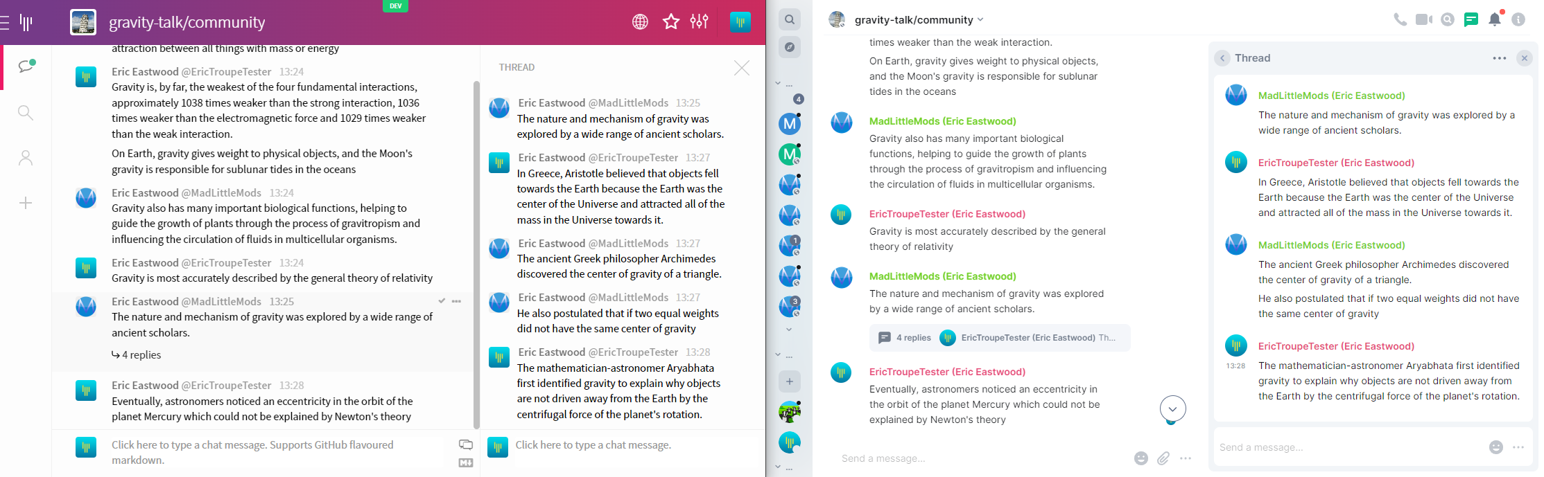 We've also been plugging along on less visible changes during this time like bug-fixes for bridging DM's and fleshing out more of the bridge scenarios like leaving or deleting a room and bans to ensure things stay in sync. We also started bridging private conversations to Matrix behind the scenes back in February so we have a break-away point-in-time to import back from when we do the massive history import to backfill everything. Please note, that you still can't access these private rooms on Matrix but this will come later either in the form of inviting MXID's from the Gitter side or when we give access to the gitter.im homeserver itself to self-manage from that side.
