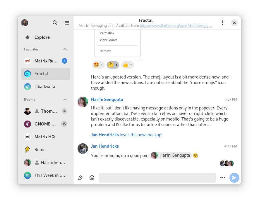 We just released Fractal 5! It is a full rewrite compared to Fractal 4, that now leverages GTK 4, libadwaita, and the Matrix Rust SDK. The two-and-a-half-year effort brings a new interface that fits all screens, big πŸ–₯️ or small πŸ“±, but should still look familiar to users of earlier versions.